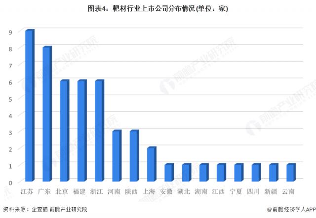 從代表性上市企業(yè)分布情況來看,上述靶材企業(yè)中我國上市公司共 51 家,涵蓋上游靶材料供應(yīng)、靶材制造和檢測設(shè)備制造企業(yè)、靶材制備、下游應(yīng)用等產(chǎn)業(yè)鏈各個環(huán)節(jié)。其中江蘇省靶材上市企業(yè)數(shù)量最多,達(dá) 9 家;其次是廣東省,有 8 家上市公司;北京、福建、浙江各有 6 家上市企業(yè)。