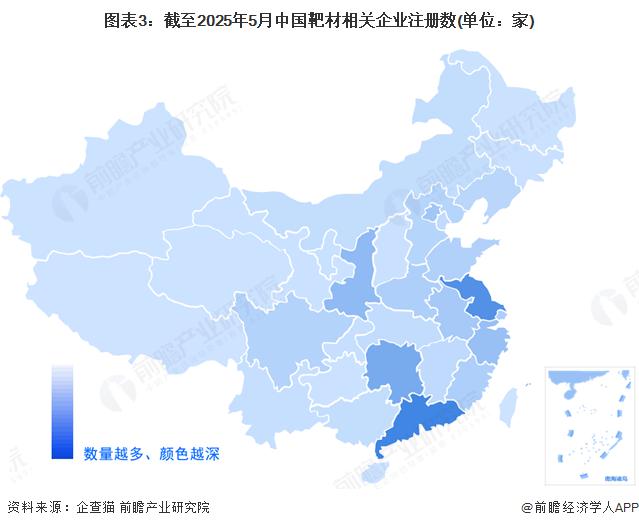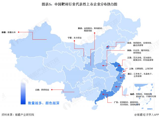 2、中國靶材產(chǎn)業(yè)鏈區(qū)域熱力地圖:主要集中在廣東和江浙地區(qū)