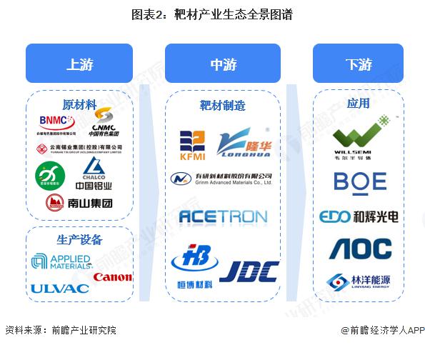 我國靶材行業(yè)上游原材料企業(yè)有中國有色、中國鋁業(yè)、南山集團(tuán)等,生產(chǎn)設(shè)備企業(yè)主要被國際企業(yè)壟斷,如 AMAT ( 美國 ) 、ULVAC ( 日本 ) 等;中游靶材生產(chǎn)企業(yè)包括江豐電子、有研新材、隆華科技等;下游廣泛應(yīng)用于韋爾半導(dǎo)體 ( 半導(dǎo)體 ) 、京東方 ( 平面顯示 ) 、林洋能源 ( 光伏 ) 等領(lǐng)域企業(yè)。