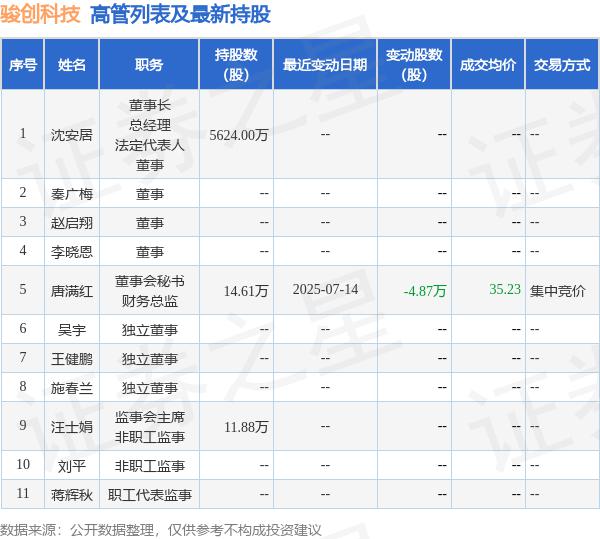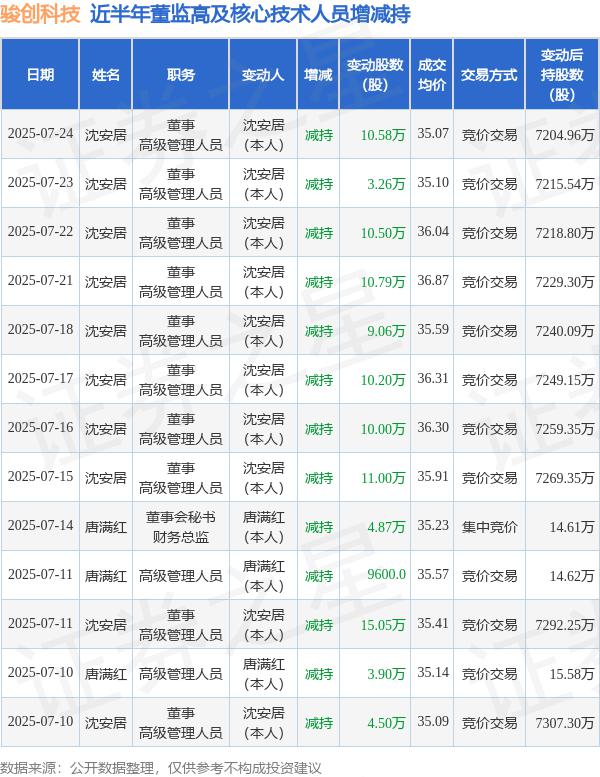據證券之星消息,依據7月26日市場公開信息、上市公司公告及交易所披露數據可知,駿創(chuàng)科技(833533)最新董監(jiān)高及相關人員股份出現變動。在2025年7月23日至2025年7月24日期間,公司董事兼高級管理人員沈安居共計減持公司股份13.84萬股,占公司總股本的0.1059%。在此變動期間,公司股價下跌了2.01%,7月24日當日收盤價格為35.15元。