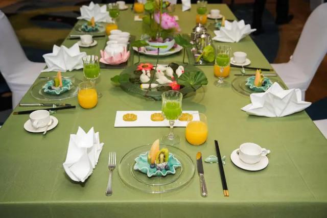 比賽裁判陳美華與陳金鳳都是國(guó)家級(jí)考評(píng)員,她們表示,餐飲擺臺(tái)是綜合技能的較量,既考查選手對(duì)食材選擇的把握,也考量其美學(xué)理念,通過餐、點(diǎn)、盤、杯等的選擇和擺放,最終要達(dá)到“相得益彰,錯(cuò)落有致”的效果。