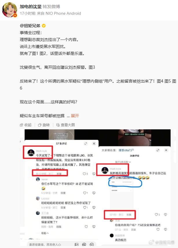 博主 @扭矩兄弟昨天曬圖稱:“這個(gè)所謂的黑水軍疑似‘理想內(nèi)測(cè)組’用戶”,這條博文也被蔚來(lái)樂道總裁沈斐轉(zhuǎn)發(fā)。