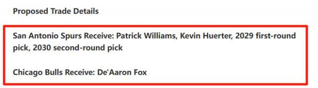 美媒提出的交易方案是:馬刺得到帕特里克?威廉姆斯、凱文?赫爾特、2029年首輪選秀權(quán)以及2030年次輪選秀權(quán);公牛隊(duì)則得到??怂?。對于重建中的馬刺隊(duì),他們看重未來潛力。帕特里克?威廉姆斯和神射手凱文?赫爾特雖不是超級(jí)巨星,但在新環(huán)境中有望突破,且他們的投籃能力能為文班亞馬拉開進(jìn)攻空間。此外,馬刺隊(duì)還能得到兩個(gè)選秀權(quán),充實(shí)未來人才儲(chǔ)備。