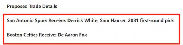 建議的交易詳情為:圣安東尼奧馬刺得到德里克?懷特、薩姆?豪瑟以及2031年首輪選秀權(quán);波士頓凱爾特人得到??怂?。福克斯是NBA令人垂涎的后衛(wèi),能為馬刺帶來優(yōu)質(zhì)交易選擇。德里克?懷特和薩姆?豪瑟經(jīng)驗(yàn)豐富、技術(shù)全面,能在圣安東尼奧發(fā)揮重要作用,2031年的首輪選秀權(quán)也為馬刺未來規(guī)劃增添籌碼。