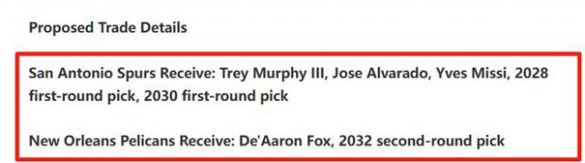 交易方案如下:圣安東尼奧馬刺隊(duì)獲得特雷?墨菲三世、何塞?阿爾瓦拉多、伊夫?米西以及2028年首輪選秀權(quán)、2030年首輪選秀權(quán);新奧爾良鵜鶘隊(duì)收到??怂古c2032年次輪選秀權(quán)。對于馬刺隊(duì),這一方案很有吸引力。特雷?墨菲三世、何塞?阿爾瓦拉多和伊夫?米西能為球隊(duì)輪換陣容帶來積極影響,而兩個(gè)首輪選秀權(quán)更為重要,為球隊(duì)年輕核心升級(jí)提供機(jī)會(huì),也讓球隊(duì)在未來交易中有更多主動(dòng)權(quán)。