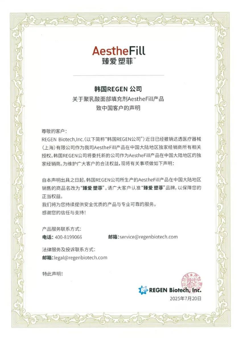 7月18日晚,一封郵件送達的《解約函》點燃了兩家公司的商戰(zhàn)。愛美客控股的韓國Regen公司單方面宣布,撤銷達透醫(yī)療作為艾塑菲產(chǎn)品在中國大陸?yīng)毤医?jīng)銷商的所有授權(quán),禁止其以經(jīng)銷商身份開展經(jīng)營活動,并不再接收新訂單。