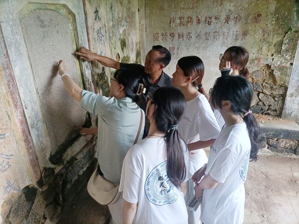 團隊辨認古道涼亭“九一亭”的碑刻銘文 李俊/攝