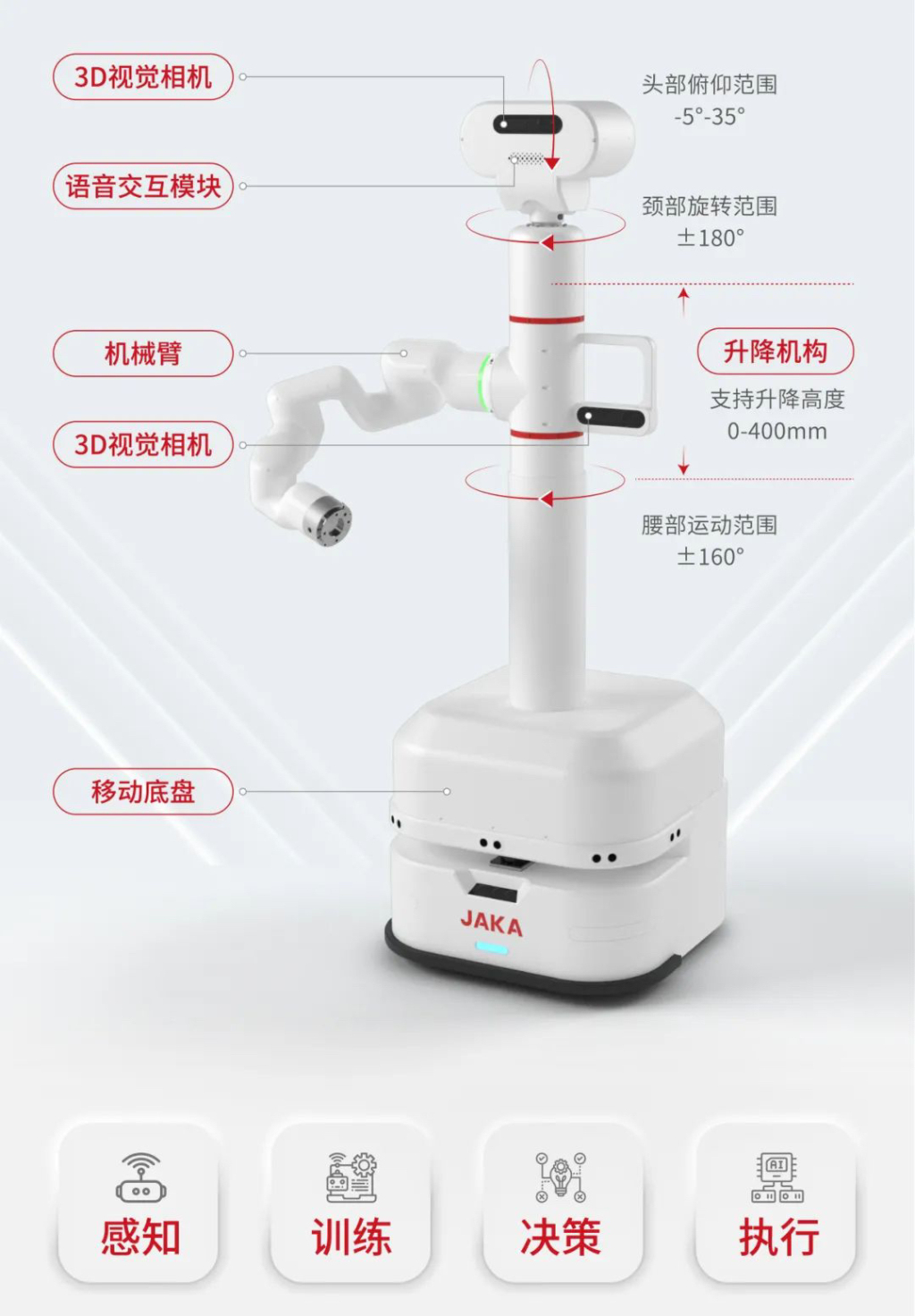 據(jù)介紹,JAKA Lumi具身智能平臺是以“感知 - 訓練 - 決策 - 執(zhí)行”為核心的一站式智能訓練平臺,專為輕量型場景設(shè)計,滿足商業(yè)零售、科研教育、生物化學等多領(lǐng)域需求。平臺集成12自由度協(xié)同運動系統(tǒng)、智能升降模塊及多模態(tài)傳感器,可自由搭載JAKA + 生態(tài)圈靈巧手、電動夾爪等末端執(zhí)行器,構(gòu)建具身智能的完整工具鏈。JAKA Lumi平臺整機系統(tǒng)適用于商超、酒店、學校、家庭等靈活作業(yè)場景,具備單臂負載2kg、腰部±160°旋轉(zhuǎn)、頸部±180°旋轉(zhuǎn)、6自由度的機械臂、0 - 400mm升降作業(yè)空間,能以類人化的靈活運動,精準完成配送、分揀等操作。
