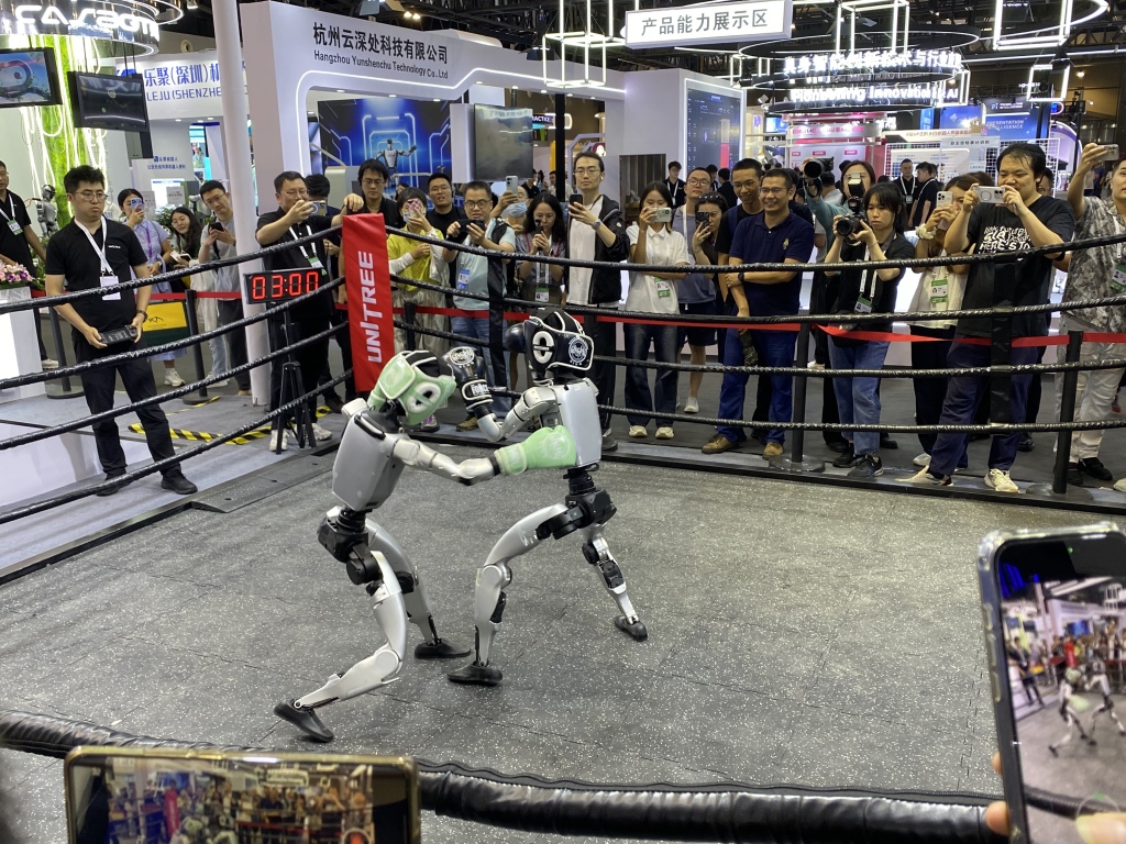 當天下午,宇樹科技展臺的小型拳擊場被觀眾圍得水泄不通。該公司研制的兩個人形機器人Unitree G1揮舞著雙拳,打得難解難分。上步、后退、伺機出拳,動作十分專業(yè)。一個回合下來,其中一個機器人的頭部外殼被擊落在地,引得現(xiàn)場觀眾哈哈大笑。