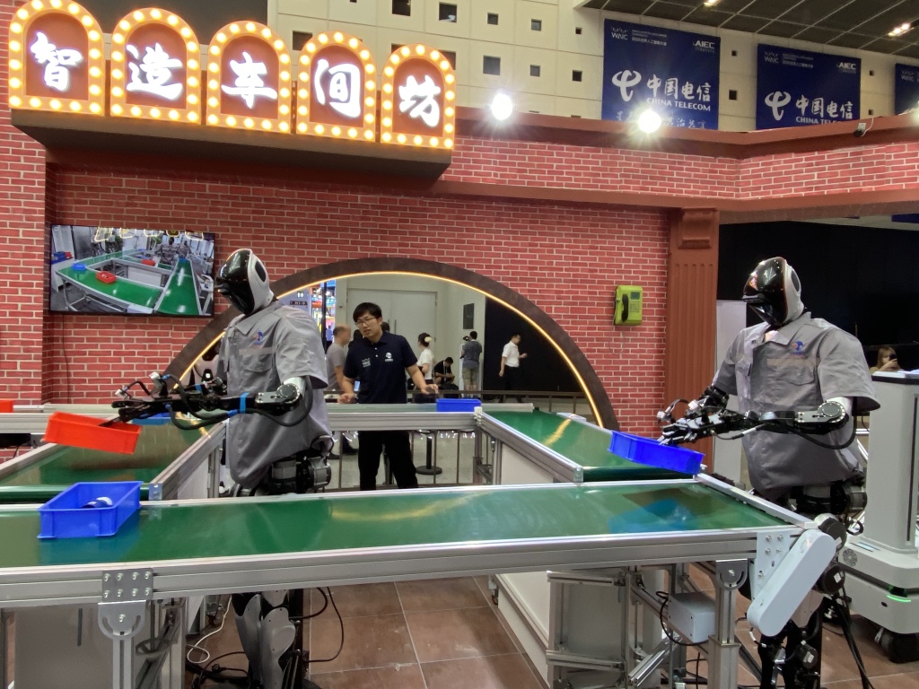 模擬制造車間的人形機器人工作場景亮相世博展覽館。澎湃新聞記者 俞凱 圖