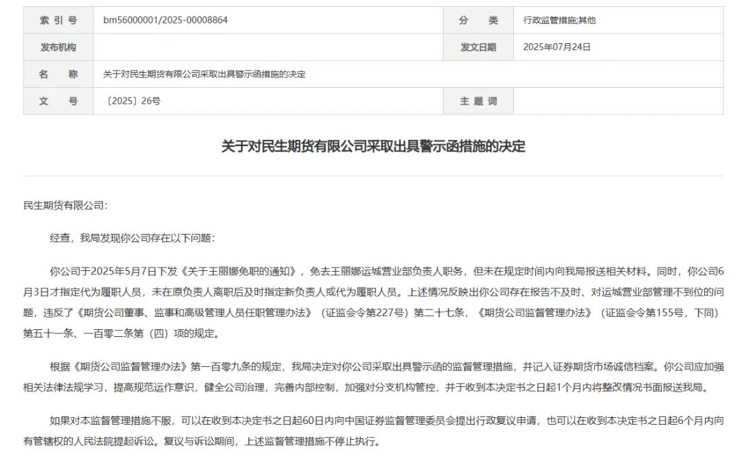 7月24日,山西證監(jiān)局發(fā)布了一份行政監(jiān)管措施決定書,指出民生期貨存在違規(guī)行為。