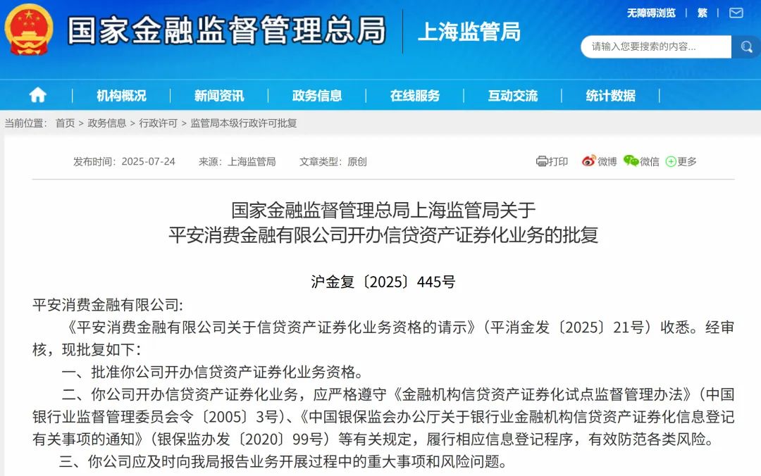記者梳理國(guó)家金融監(jiān)督管理總局網(wǎng)站披露的信息得知,平安消金是今年首家獲批開展ABS業(yè)務(wù)的消金機(jī)構(gòu)。上一家被監(jiān)管核準(zhǔn)開展ABS業(yè)務(wù)的消金機(jī)構(gòu)是小米消金,獲批時(shí)間為2024年9月。此前的2024年7月和8月,中信消金和寧銀消金分別取得發(fā)行ABS的資格。