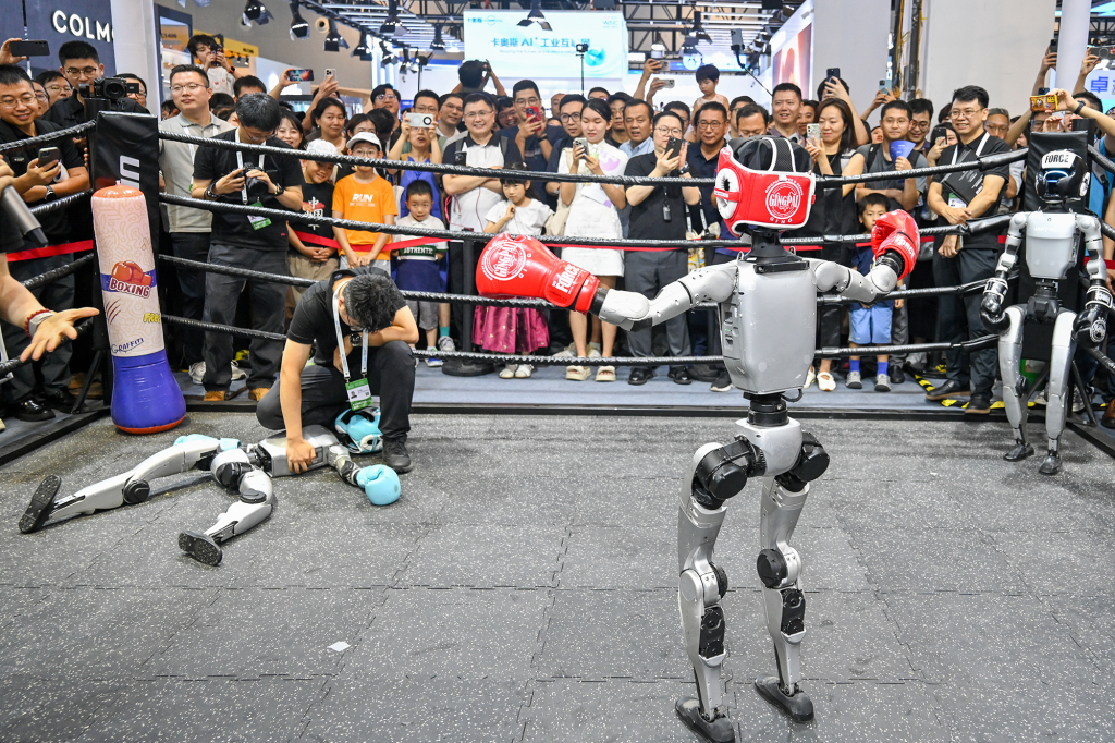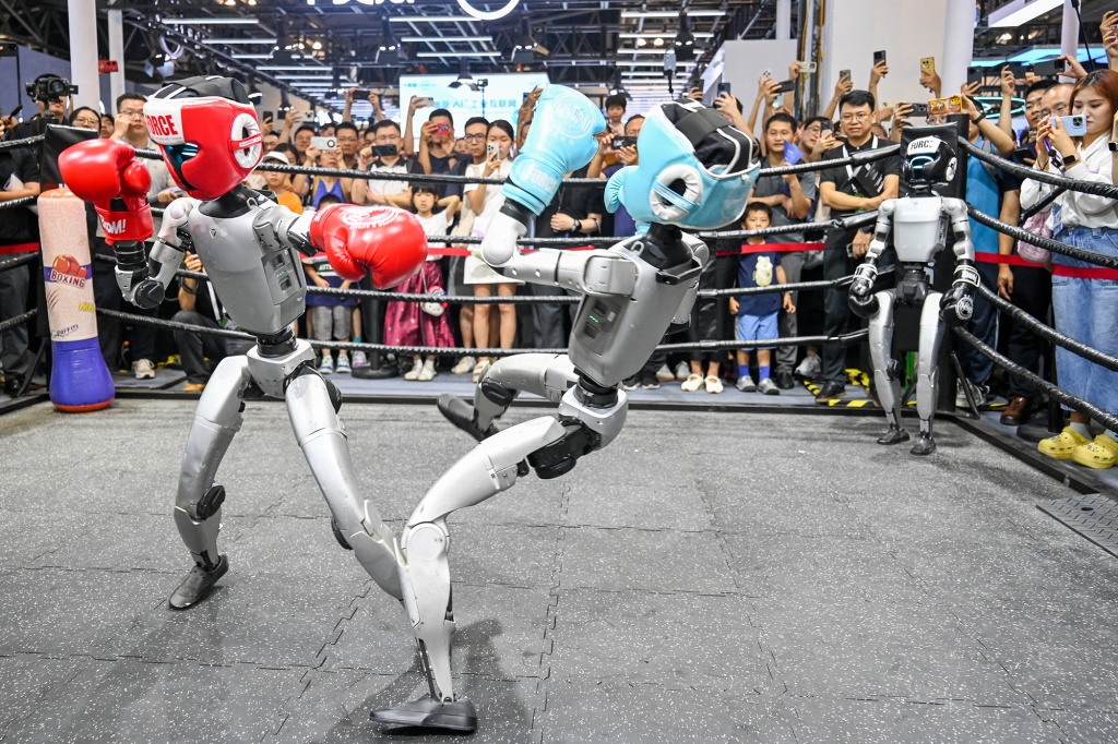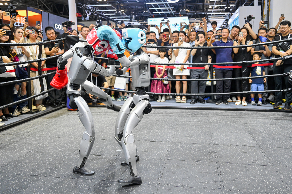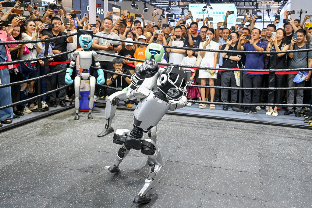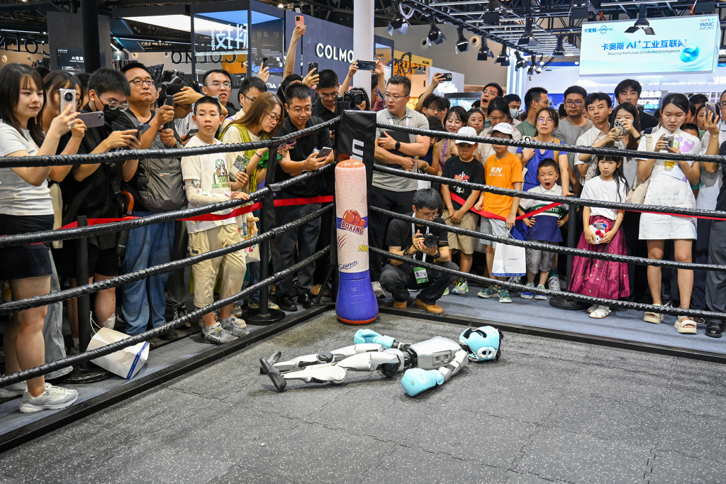 “太強(qiáng)了!”、“小綠加油!”、“這一記勾拳漂亮!”……7月26日,在上海世博展覽館舉行的2025世界人工智能大會上,宇樹科技機(jī)器人格斗比賽吸引了眾多目光。