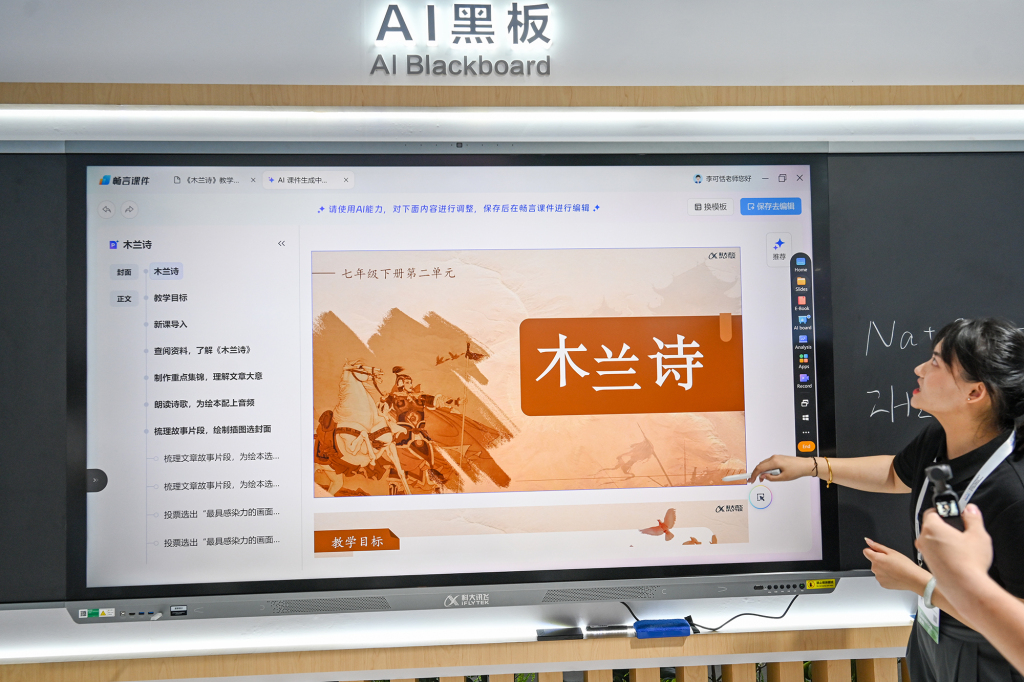 2025年7月26日,上海世博展覽館,科大訊飛的AI黑板??拼笥嶏wAI黑板圍繞教育教學(xué)“公平性、高效性、智慧性、安全性”構(gòu)建標(biāo)準(zhǔn),通過AI感知 - 決策 - 服務(wù)閉環(huán),實現(xiàn)從被動輸出向主動服務(wù)、從人機(jī)交互向人機(jī)共生的躍遷,讓黑板從板書工具轉(zhuǎn)變?yōu)榻處烝I助手。澎湃新聞記者 朱偉輝 圖