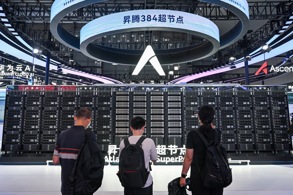 2025年7月26日,上海世博展覽館,華為昇騰超節(jié)點技術(shù)突破384卡高速互聯(lián),通信帶寬提升15倍,使千億級模型性能提升2.5倍以上。澎湃新聞記者 朱偉輝 圖