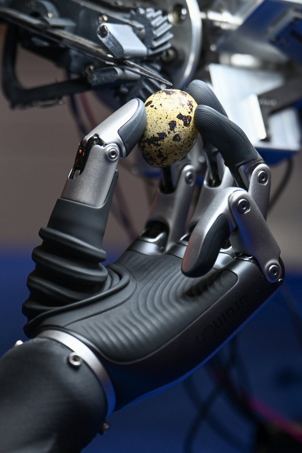 2025年7月26日,上海世博展覽館,一款國產(chǎn)手術(shù)機(jī)器人正在表演剝生鵪鶉蛋的蛋殼,可以做到破殼不破膜。澎湃新聞記者 朱偉輝 圖