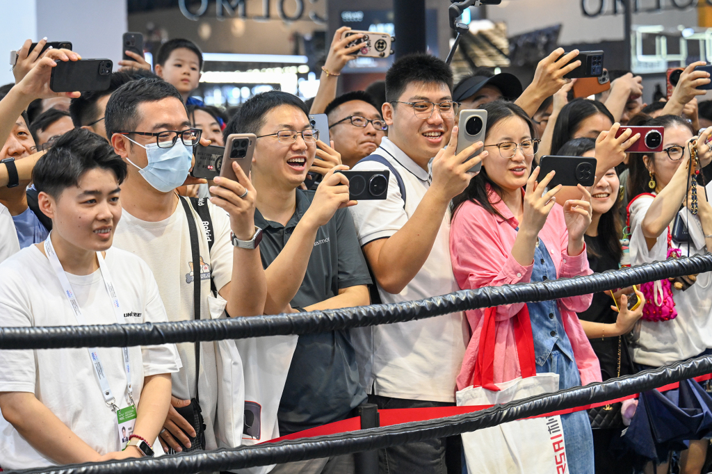 2025年7月26日,上海世博展覽館,宇樹科技G1格斗機(jī)器人在進(jìn)行拳擊比賽,觀眾看得津津有味。澎湃新聞記者 朱偉輝 圖
