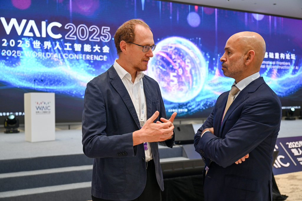 2025年7月26日,上海世博展覽館,人工智能的數(shù)學(xué)邊界與基礎(chǔ)重構(gòu)論壇,兩名外籍嘉賓在交流。澎湃新聞記者 朱偉輝 圖