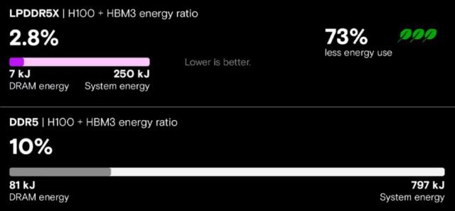 測試LPDDR5X存儲器(在搭載NVLink的NVIDIA GH200 Grace Hopper超級芯片上)與傳統(tǒng)DDR5存儲器(在搭載PCIe連線Hopper GPU的x86系統(tǒng)上)時,結(jié)果顯示LP存儲器實現(xiàn)了關(guān)鍵的效能提升。使用Meta Llama 3 70B測試推理效能時,LP存儲器系統(tǒng)推理吞吐量提高了5倍、延遲減少了近80%、能源消耗降低了73%。