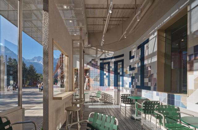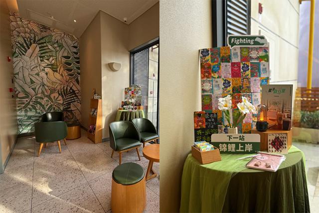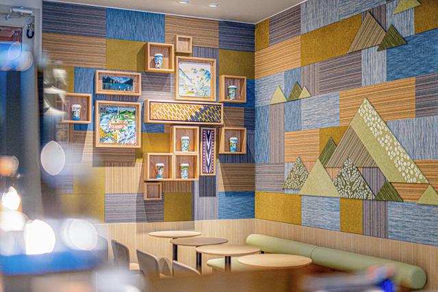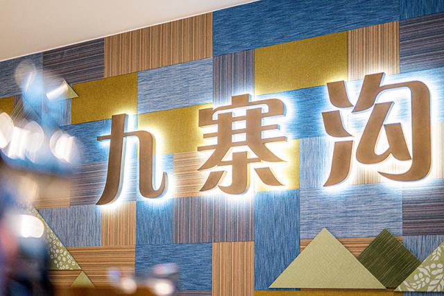 該店鋪毗鄰九寨溝景區(qū)入口,為單層空間。設(shè)計(jì)上以九寨山水人文為靈感,外立面用天然肌理板材模擬了九寨溝水底鈣化沉積的獨(dú)特地貌,以星巴克標(biāo)志性的綠色呼應(yīng)九寨溝的林海;店內(nèi)有巨幅布藝裝置,以層疊織物拼出四季彩林,還有“九寨溝”字樣點(diǎn)綴。