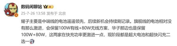 【CNMO 科技消息】7 月 26 日,知名數(shù)碼博主數(shù)碼閑聊站爆料,榮耀中端線電池將遙遙領(lǐng)先,后續(xù)新機(jī)會(huì)持續(xù)刷新記錄。旗艦線的電池相對(duì)沒那么激進(jìn),會(huì)保留 100W 有線 +80W 無線方案,華為同樣保留 100W+80W 的方案,這兩家在快充功率方面更激進(jìn)些,現(xiàn)階段都是超大電池和超快閃充二選一。