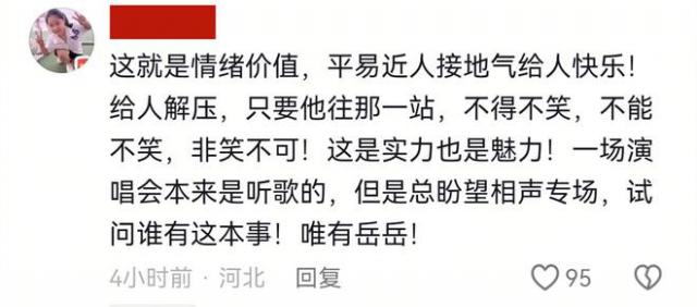 看過演唱會(huì)的網(wǎng)友評(píng)論稱,他們非常開心,認(rèn)為這場演唱會(huì)情緒價(jià)值十足,花錢很值得。從現(xiàn)場視頻能看出,氛圍十分熱烈,岳云鵬也帶來了諸多驚喜。