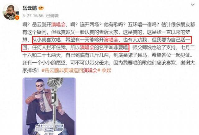 面對(duì)爭議,岳云鵬并未回避。他發(fā)文回應(yīng)稱自己從小就熱愛唱歌,開演唱會(huì)是他的夢想。他表示要為自己活一回,誰也攔不住,因此將演唱會(huì)取名為“非要唱”。