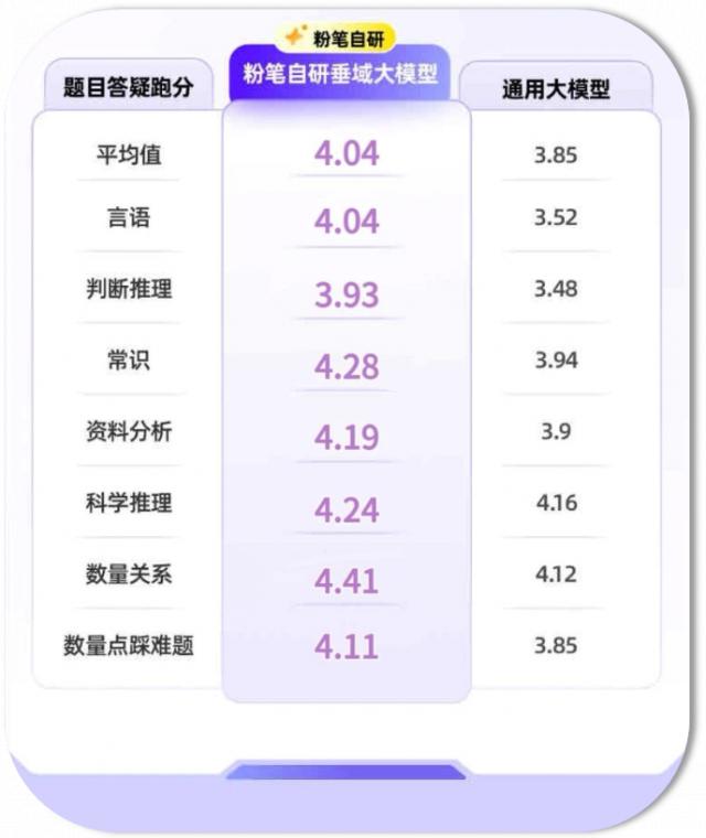 第二階段,2024年7月,粉筆AI老師正式推出,這標(biāo)志著粉筆AI應(yīng)用從單點(diǎn)場景邁向系統(tǒng)化、多場景融合。基于粉筆獨(dú)有的高質(zhì)量知識(shí)庫數(shù)據(jù)、教研對教學(xué)方法的長期積累以及對用戶的深度洞察,借助檢索增強(qiáng)生成(Retrieval - augmented Generation)疊加粉筆垂域大模型,能極大降低“幻覺”概率。據(jù)內(nèi)部測算,粉筆垂域大模型平均評分比通用模型高出約0.2分,尤其在言語、判斷推理和常識(shí)等科目上表現(xiàn)更為出色。