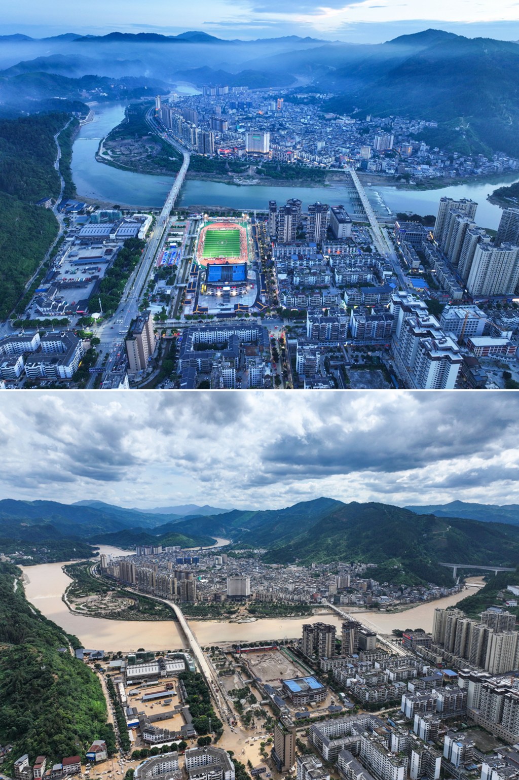 這里有拼版照片:上圖為7月25日在貴州榕江拍攝的災(zāi)后重建后的“村超”球場(chǎng)(無人機(jī)照片);下圖為6月25日在貴州榕江拍攝的遭受洪水襲擊的“村超”球場(chǎng)(無人機(jī)照片)。當(dāng)日,貴州榕江舉行了主題為“感恩重啟·貴州超力量”的超級(jí)星期六活動(dòng),球星巴喬、卡洛斯來到現(xiàn)場(chǎng)助陣,助力“村超”重燃賽事,正式回歸。6月下旬,貴州榕江遭受特大洪水,貴州“村超”球場(chǎng)損失嚴(yán)重。經(jīng)過約一個(gè)月的重建和準(zhǔn)備,系列賽事和民俗展演陸續(xù)恢復(fù)。 新華社記者 楊文斌 攝