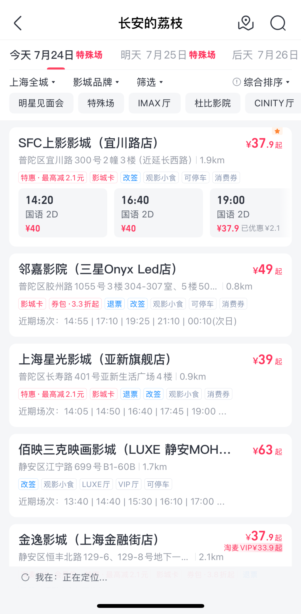 為了測試購買電影票后能否退票以及退票難度,澎湃新聞“馬上測”分別在淘票票、貓眼、美團(tuán)、大眾點(diǎn)評、京東,選擇SFC上影影城(新世界店)、佰映三克映畫影城、國泰電影院、上海星光影城亞新店,購買了暑期檔熱門電影《長安的荔枝》24小時內(nèi)相近場次的電影票。