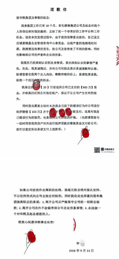 聲明末尾,華熙生物附上了立案告知書和李某的道歉信。道歉信顯示,“在本次發(fā)債過程中,由于我的法律意識淡泊,自己設(shè)立應(yīng)城麥錫墾企業(yè)管理咨詢中心拿獎金,出現(xiàn)嚴重的違規(guī)違紀問題?!?/p>