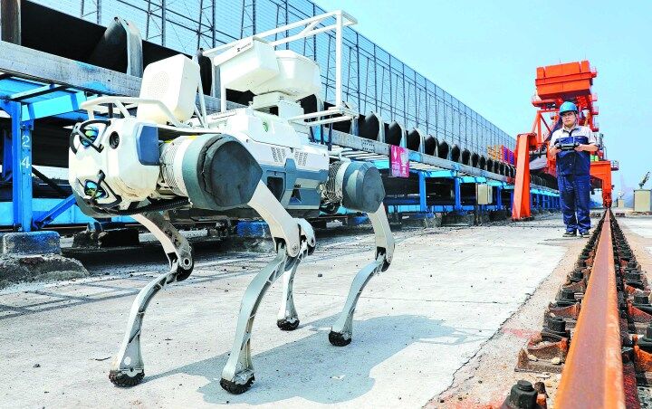 7月23日,在秦港股份九公司貨運現(xiàn)場,一只機器狗正邁著矯健步伐在煤炭堆場穿梭,開展皮帶機巡檢工作。