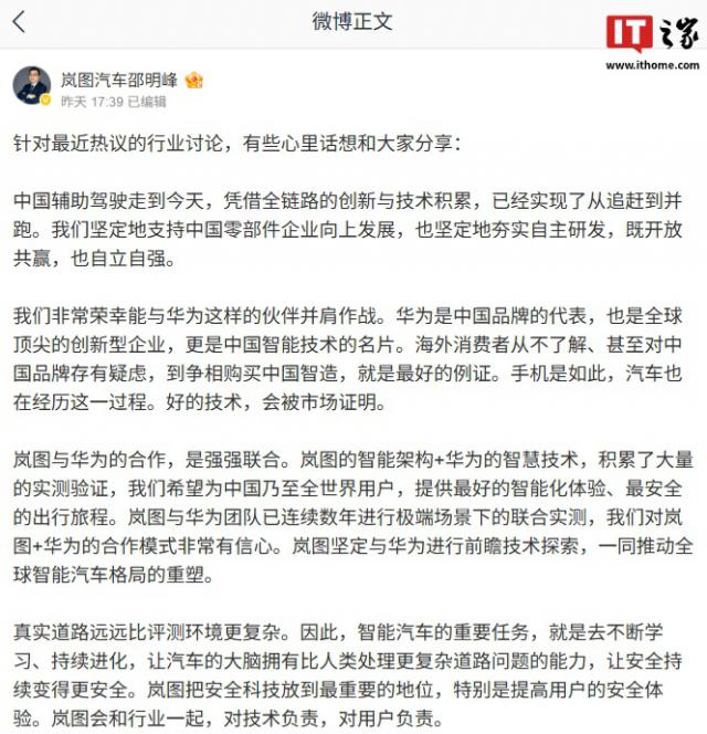 IT之家留意到,嵐圖汽車CBO、銷售公司總經(jīng)理邵明峰在表達(dá)“懂車帝封閉高速測試如同一面鏡子,映照出行業(yè)在極端場景下仍存技術(shù)共性瓶頸”這一觀點后,于昨日晚通過微博發(fā)表了對智能輔助駕駛的看法。原文如下: