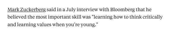 同樣,扎克伯格在 Bloomberg 的一次采訪中也提到,他認(rèn)為最重要的技能是“學(xué)習(xí)如何批判性思考和學(xué)習(xí)價值觀”。