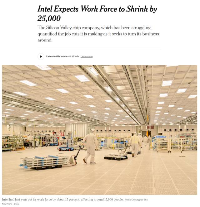 彼時的 Intel 早已風(fēng)光不再。業(yè)績下滑、市場份額流失、制造轉(zhuǎn)型困局接連出現(xiàn)。2024 年秋天,Intel 也曾尋求自救:將公司重組為兩個部門,一個負(fù)責(zé)設(shè)計芯片,另一個負(fù)責(zé)制造芯片,這就是上一任 CEO Gelsinger 提出的“代工廠”計劃;部門重組之余還開始大規(guī)模裁員,去年 8 月,Intel 就官宣過一次約 1.5 萬人的裁員計劃。