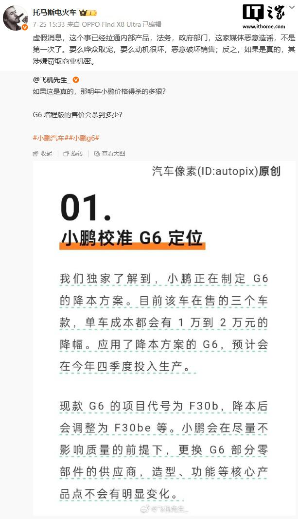 IT之家7月27日消息,7月25日,小鵬汽車副總裁 @托馬斯電火車 在微博作出回應,明確表示網(wǎng)絡上流傳的“小鵬正在制定G6降本方案”是虛假消息。小鵬方面已聯(lián)動內(nèi)部產(chǎn)品、法務以及政府部門來處理此事,還指出涉事媒體存在多次惡意造謠的情況,若此消息是真的,那么涉事方就涉嫌竊取商業(yè)機密。