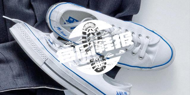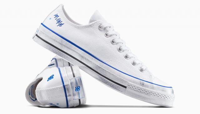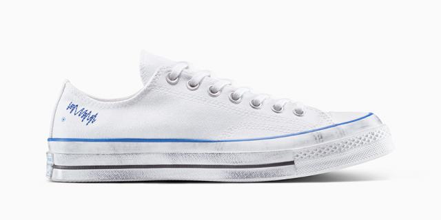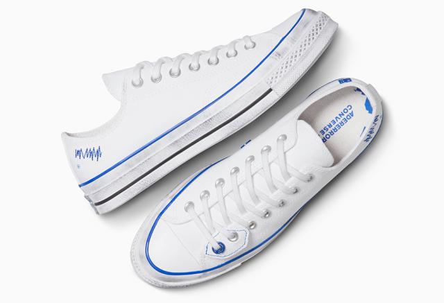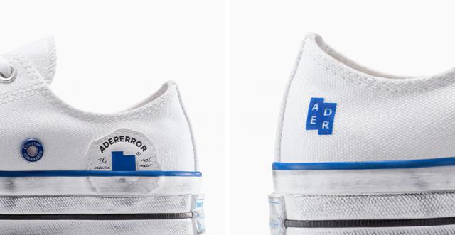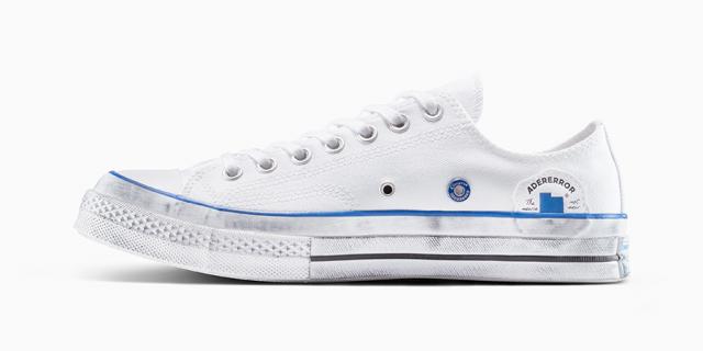 這是一款Chuck 70小白鞋,融入了ADER ERROR的設(shè)計(jì)細(xì)節(jié),經(jīng)過(guò)做舊處理,橡膠圍條有ADER ERROR標(biāo)志性藍(lán)色,鞋后側(cè)有刺繡和印花彰顯聯(lián)名身份。