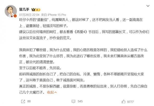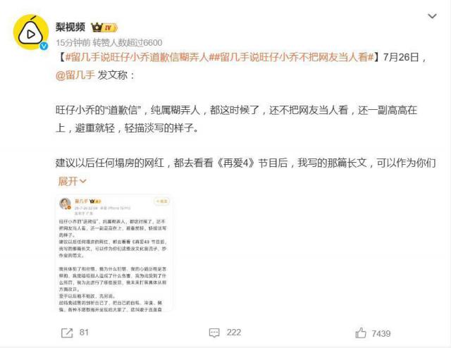 留幾手批旺仔小喬道歉信“糊弄人”引關(guān)注