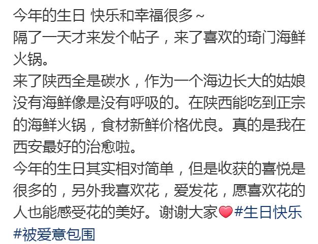 雖說王曉晨在陜西過生日,但當(dāng)天她沒吃當(dāng)?shù)孛媸硲c祝。作為山東姑娘,她很喜歡吃海鮮,生日這天吃了海鮮火鍋。