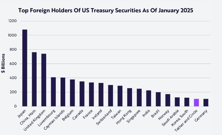 1月31日,Tether年度報告公布2024年財務(wù)業(yè)績,利潤為137億美元,僅第四季度就賺60億美元,第四季度發(fā)行230億美元的Stablecoin(USDT),年度總計達到450億美元。截至2025年3月,Tether持有980億美元美國國債;截至1月底,Circle持有超220億美元美國國債。Tether和Circle合計持有的美國國債規(guī)模排第18位,僅次于韓國,超過德國。ARK猜測,如果Tether和Circle維持目前市場份額和對美國國債的配置,到2030年,它們合計持有的美國國債總額將超過6600億美元,穩(wěn)定幣行業(yè)很可能成為美國國債的最大持有者。