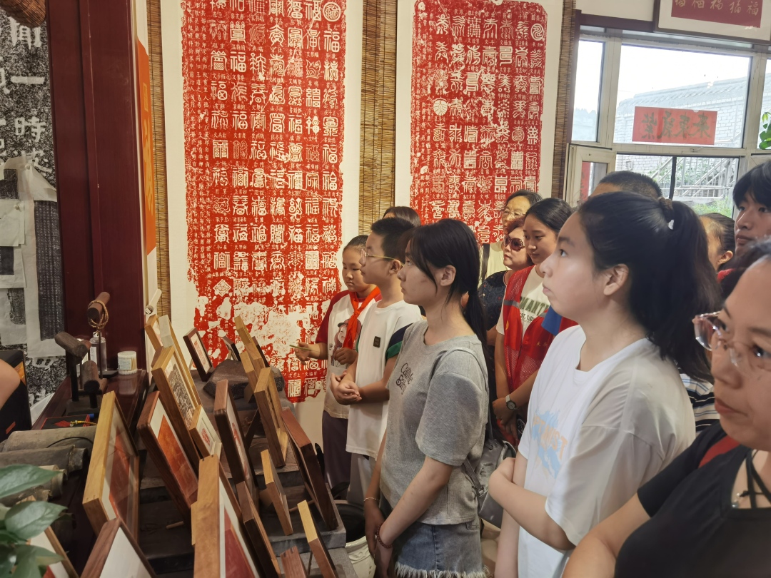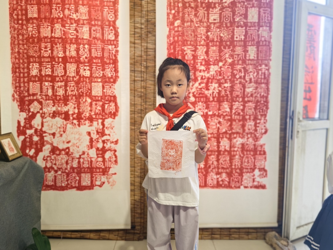 隨后,孩子們前往拓印非遺館,開啟非遺文化之旅。在志愿者老師帶領(lǐng)下,孩子們了解到中華文化的博大精深,對拓印這一古老技藝的獨特魅力驚嘆不已。從認識拓印工具到學習拓印技巧,孩子們充滿好奇與熱情,在老師耐心指導下動手制作拓印作品。當一幅幅精美作品誕生,孩子們臉上洋溢著自豪與喜悅。通過這次體驗,孩子們掌握了新技能,感受到中華傳統(tǒng)文化的深厚底蘊,增強了民族自豪感和文化自信心。