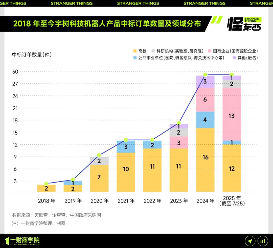 從B端的銷售情況來看,一財(cái)商學(xué)院整理了宇樹科技自2018年至今的115筆中標(biāo)訂單,中標(biāo)訂單數(shù)量呈逐年遞增的趨勢(shì),并且增速較快。截至今年7月,宇樹科技的中標(biāo)訂單數(shù)量已達(dá)29件,這一數(shù)字與2024年全年中標(biāo)訂單量持平。