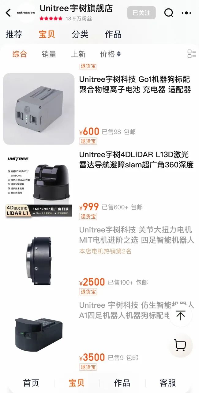 比如,宇樹中標(biāo)訂單中有不少萬元以內(nèi)的零部件采購(gòu)訂單。C端電商渠道京東、淘寶的宇樹官方店也上架了機(jī)器狗專用電池、激光雷達(dá)等零部件,價(jià)格在100-4000元不等。