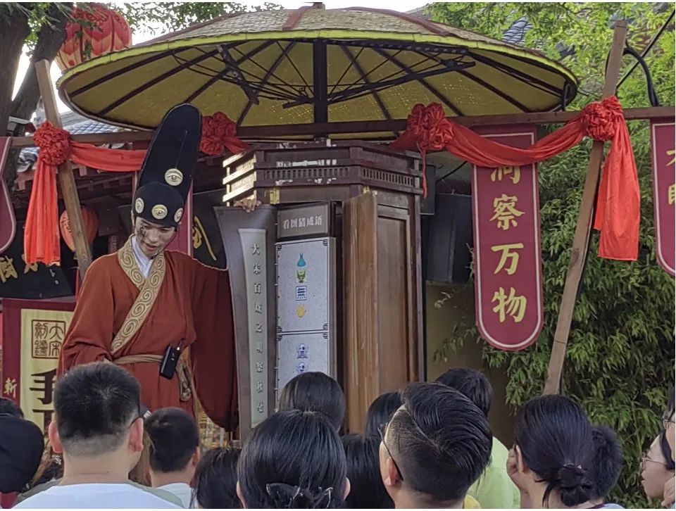 除了部分熱門節(jié)目需要預(yù)約,這座樂園還會隨時(shí)隨地給你驚喜。你在路上好端端地走著,說不定會突然竄出來兩個(gè)演員當(dāng)街“對打”,隨機(jī)開啟一場迷你演出。如果看到裝扮特殊的NPC,和他們互動就有銀票拿。最簡單的互動方式是玩石頭剪刀布,也可以猜謎語或表演節(jié)目。