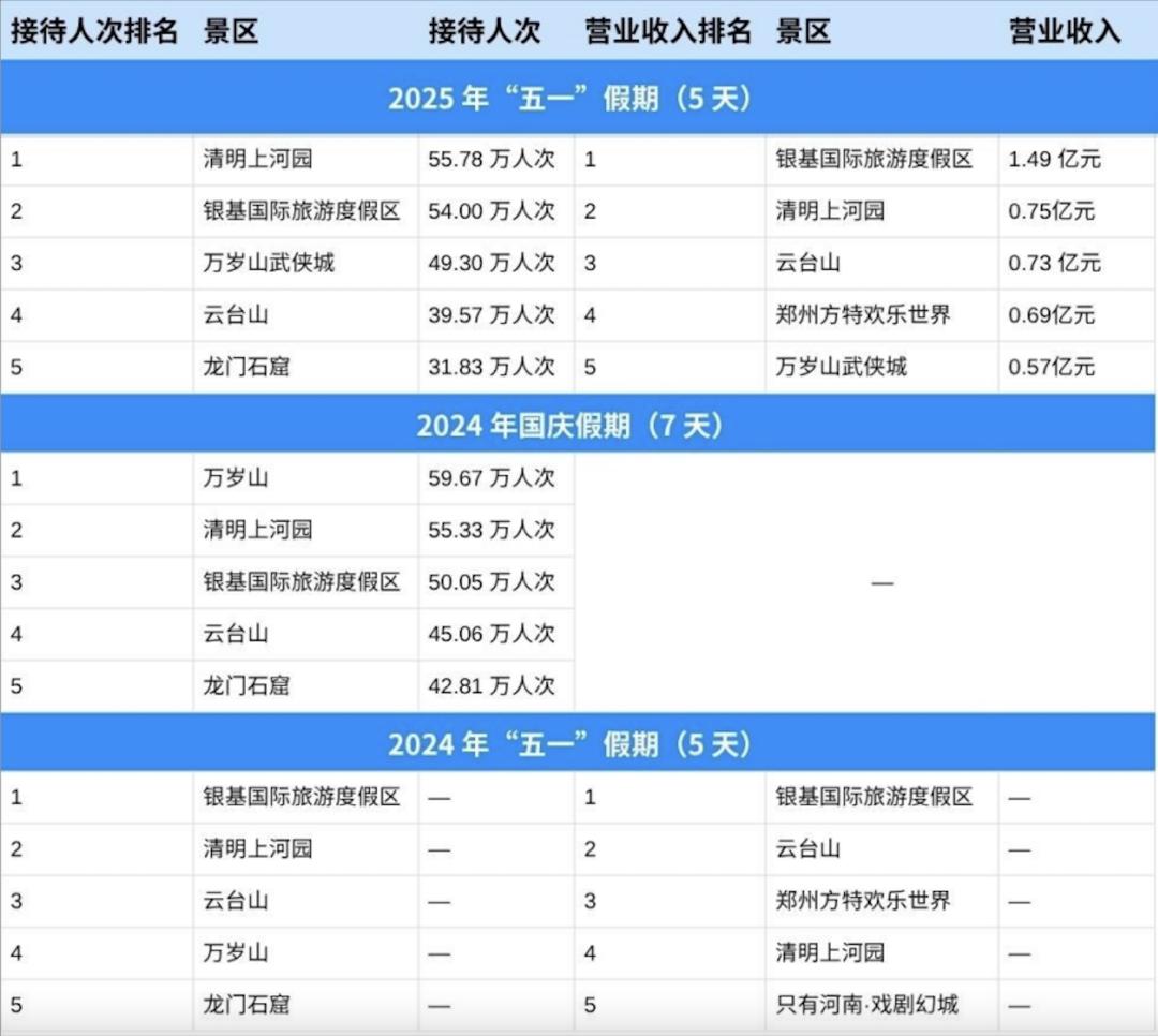 而根據(jù)河南省文化和旅游廳公布的數(shù)據(jù),近兩年主要公共假期的客流量及收入前五名中,總少不了這三個(gè)主題景區(qū):清明上河園、萬歲山武俠城、只有河南·戲劇幻城。