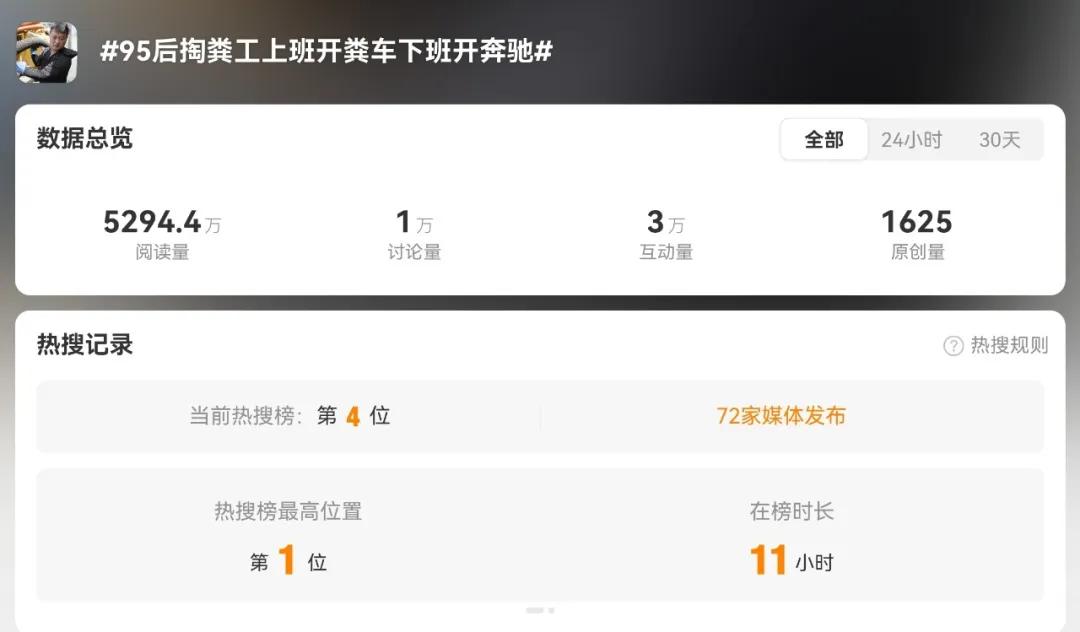 在網(wǎng)上看到一個熱搜——#95后掏糞工上班開糞車下班開奔馳