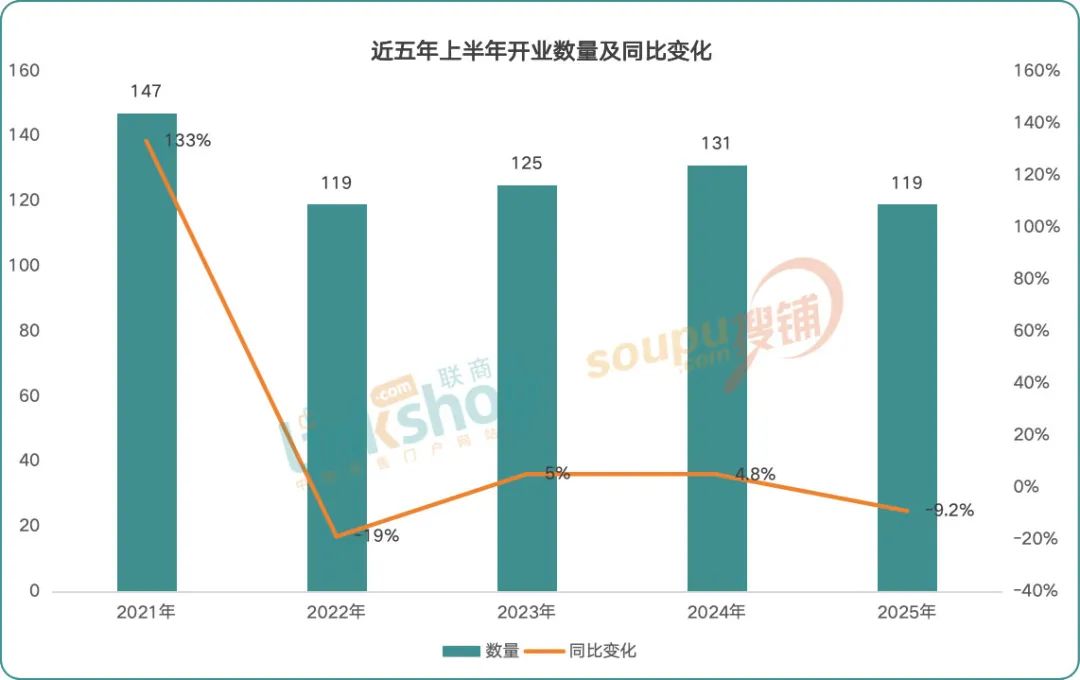 近五年數(shù)據(jù)顯示,上半年開業(yè)量的峰值出現(xiàn)在2021年的147個,隨后四年雖有所起伏,但整體呈現(xiàn)逐步回落的態(tài)勢,反映出市場進入理性調(diào)整期。具體數(shù)據(jù)上,2025上半年的開業(yè)量達119個,與2022年持平,是近五年最低,同比2024年下降9.2%。