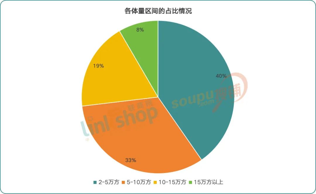 商業(yè)體量分布上,2-5萬㎡占比最高達40%,社區(qū)商業(yè)是主要商業(yè)形態(tài),匹配社區(qū)高頻消費需求。一方面是存量改造的主旋律下,傳統(tǒng)商業(yè)的體量并不大;另一方面,當前商業(yè)模式偏向個性化,比如主理人、策展型等,而這些商業(yè)模式一般都是小體量。