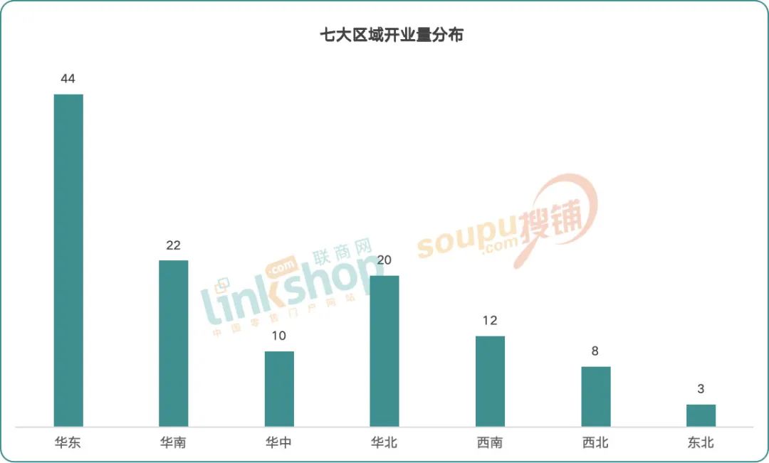 擁有四大一線城市的華東、華南和華北三區(qū)開業(yè)量合計占比達71%,展現(xiàn)出三大核心經(jīng)濟圈的商業(yè)聚集效應。重點體現(xiàn)在以下兩點:
