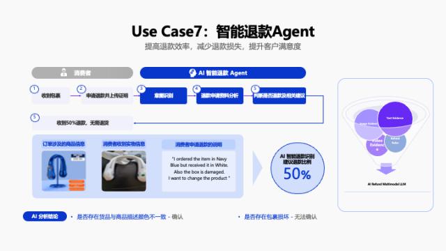 比如智能退款A(yù)gent,能快速靈活處理用戶退款訴求,降低商家售后成本。以前消費(fèi)者退款,商家多只能接受;接入AI agent后,AI客服會(huì)根據(jù)場(chǎng)景給出合理方案。如消費(fèi)者因不會(huì)使用商品退款,AI會(huì)提供使用說(shuō)明;因色差退款,AI可能給出部分退款協(xié)商方案。